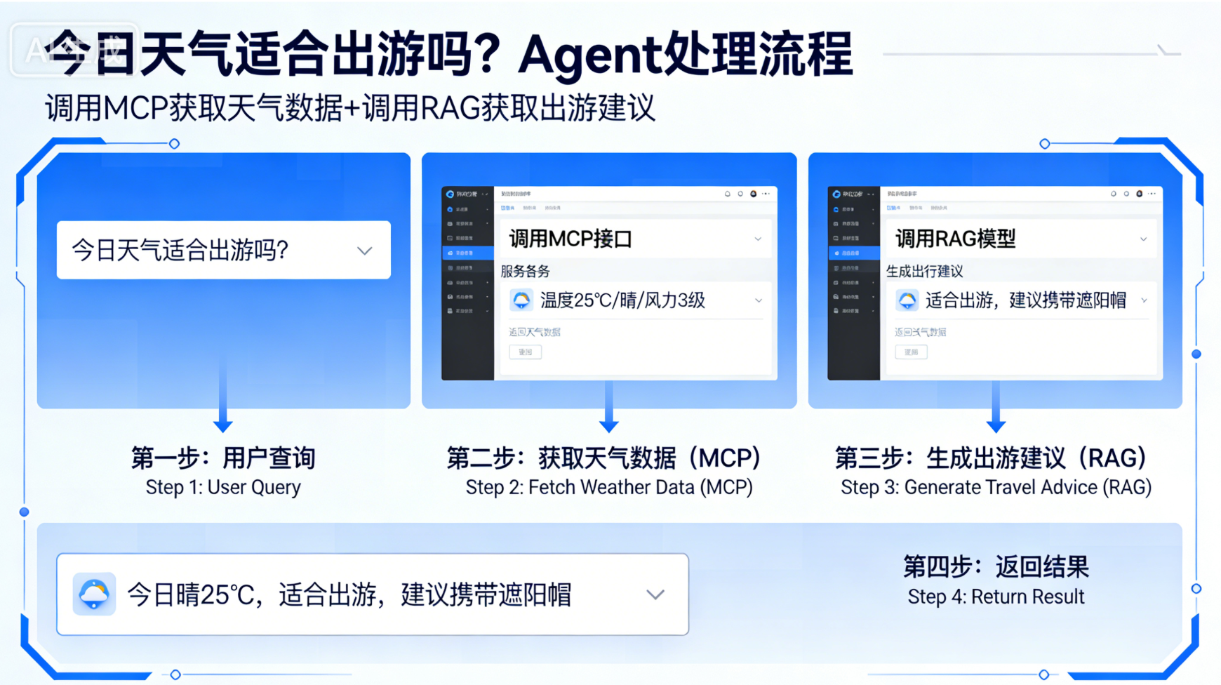 图示说明:以用户查询"今日天气适合出游吗"为例,展示Agent调用MCP获取天气数据、调用RAG获取出游建议的完整流程(中英双语标注)。