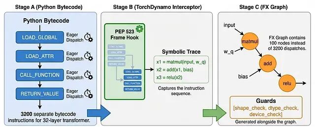 torch.compile 要解决的就是这种逐操作的开销。它会提前捕获整个计算图,核心靠两个组件:TorchDynamo 是一个 Python JIT 编译器,负责拦截字节码执行;TorchInductor 是后端,为 GPU 生成优化过的 Triton kernel,为 CPU 生成 C++ 代码。