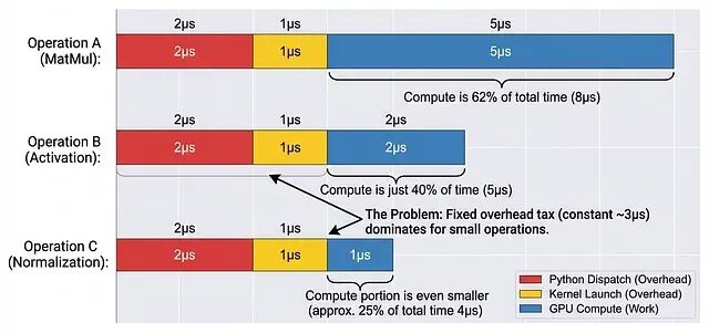 即时执行意味着每个操作独立运行。一个 32 层、每层 100 个操作的模型,前向传播一次就要触发 3200 次 kernel 启动,这些开销全部叠加到推理延迟里。