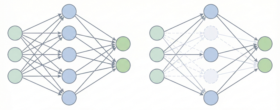 AlexNet 在前两层全连接层中引入了 Dropout 机制,缓解网络参数多带来的过拟合问题。Dropout 在每一轮训练过程中随机失活一定比例的神经元,它们不参与前向传播和反向更新。网络无法依赖某些固定的特征组合,泛化性更强