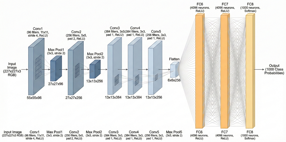 AlexNet包含5个卷积层,3 个全连接层,使用ReLU激活函数,第1、2、5个卷积层后面连接一个最大池化层,输入为RGB三通道的224 × 224 × 3大小的图像(可填充为227×227×3),最终输出层为softmax,用于预测图像的类别