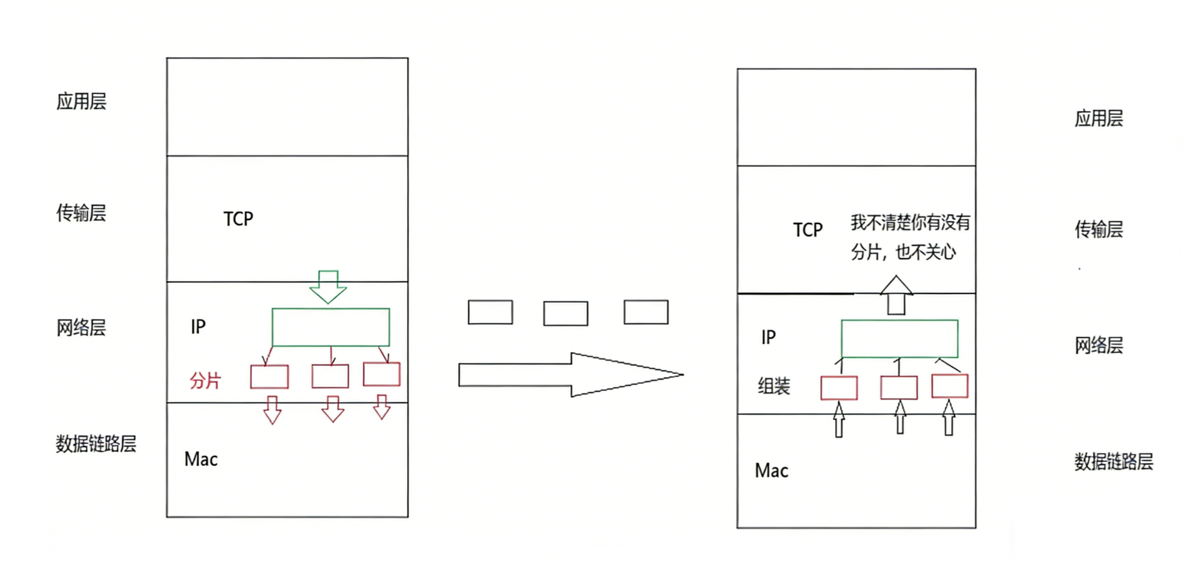 分片对传输层透明,重组后完整报文才上传。