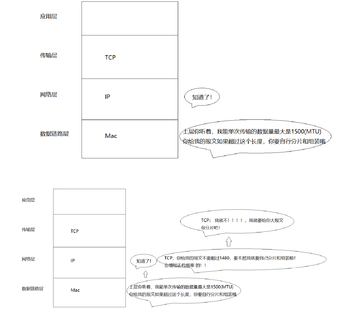 IP数据报分片与组装机制:当数据报超过网络MTU时,IP层会将其分片。