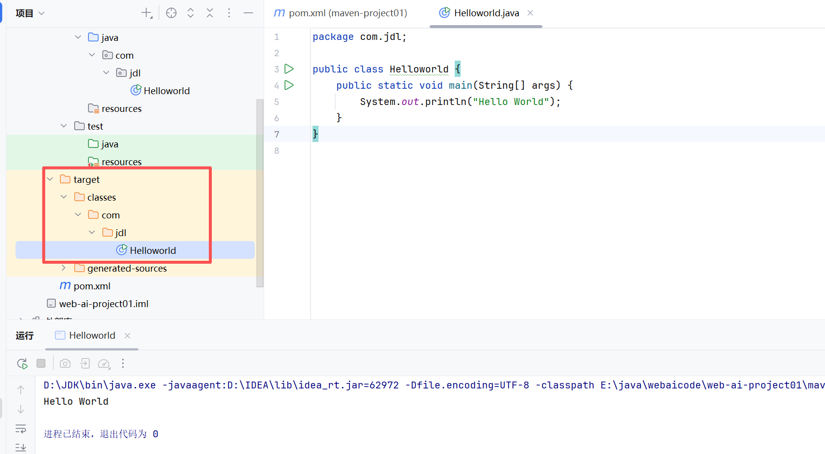 编写一个简单的hello world编译运行之后,就可以发现在target里面生成对应java程序的class文件