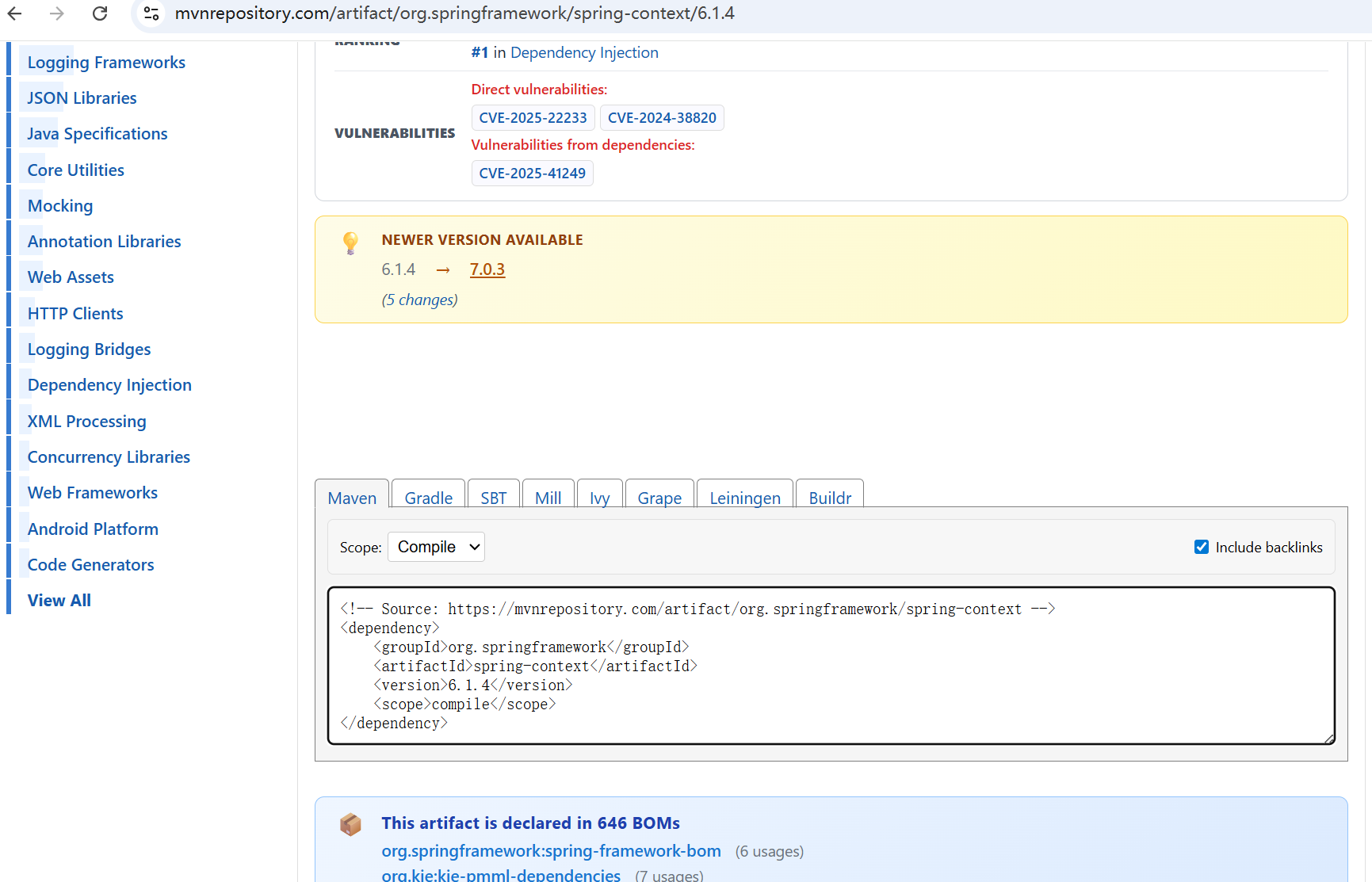 去maven依赖的网站https://mvnrepository.com/上找对应的版本,可以找到对应的dependency里面怎么配置的