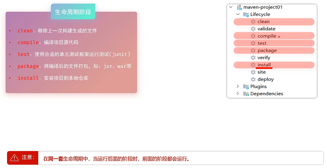 install表示安装:会把前面的compile,test,package都执行一遍,然后就安装在本地仓库