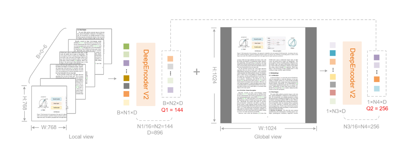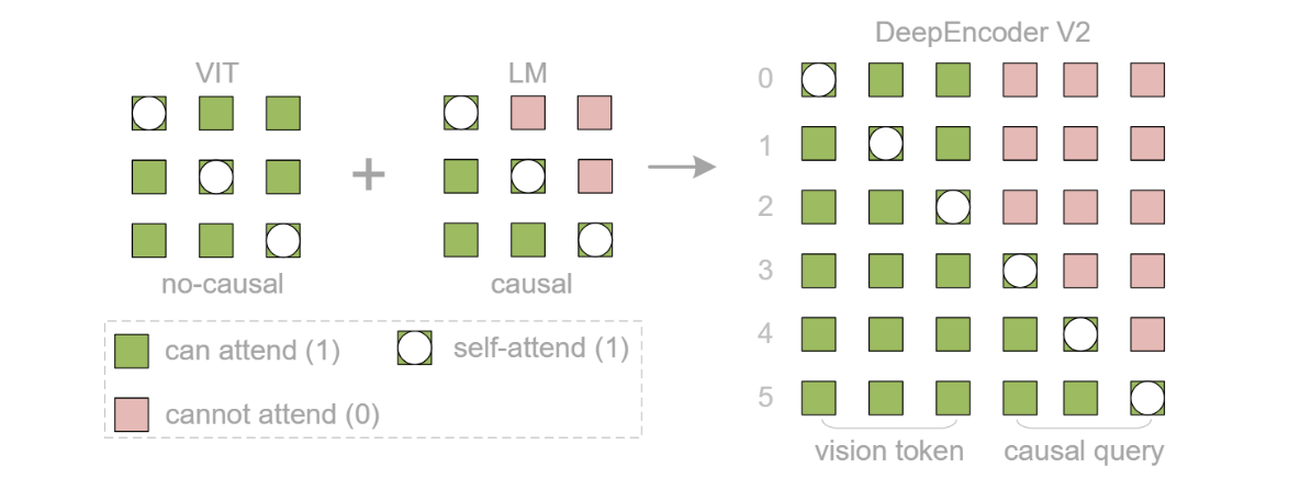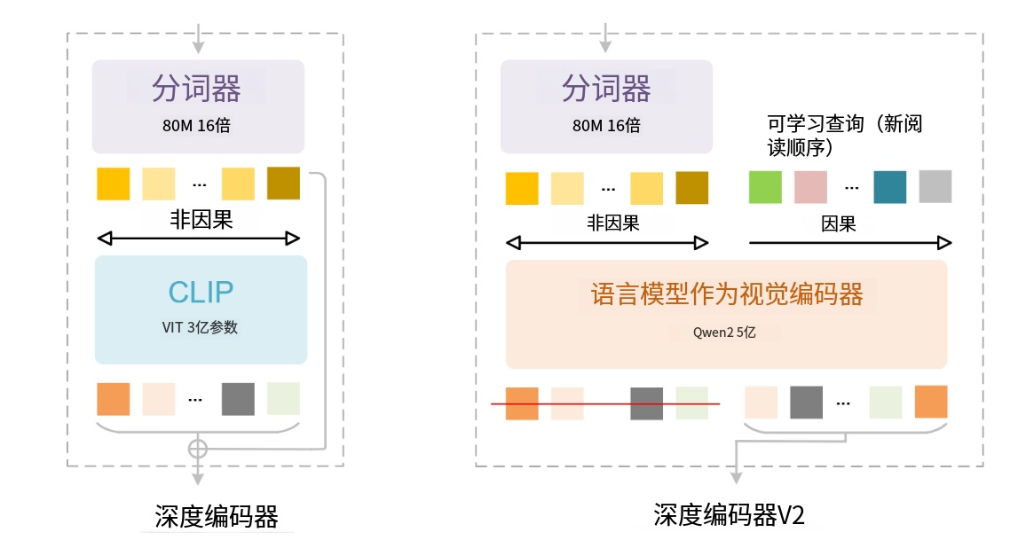 - 架构革新:替换 DeepEncoder 中的 CLIP ViT 模块,采用 Qwen2-0.5B(500M 参数)作为 LLM 风格编码器,避免额外计算开销。