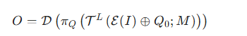 - 符号定义:I(输入图像)、E(视觉 Tokenizer)、Q0(可学习因果查询)、TL(L 层带掩码注意力的 Transformer)、πQ(提取最后 n 个 Token 的投影算子)、D(语言解码器)、O(输出 logits)。