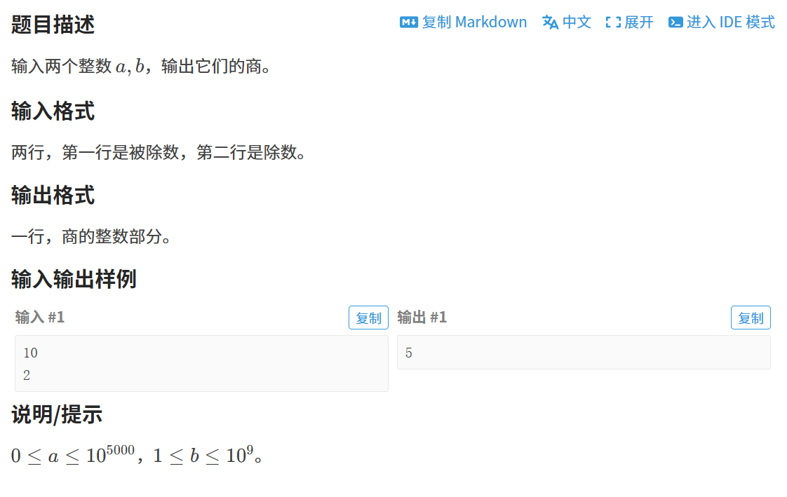 此问题要解决高精度除低精度,高精度用字符串存储,按位存储到数组中,模拟列竖式除法。