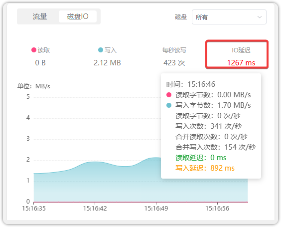 如果你看到 IO 延迟 > 1000ms,可以理解为磁盘"已经喘不过气来"了,后果包括: