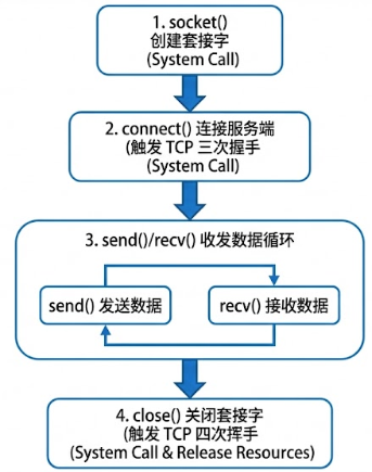 connect()触发 TCP 三次握手,成功返回后连接建立;- 客户端无需显式