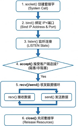 - 套接字的阻塞/非阻塞模式需根据并发需求选择,非阻塞模式需配合 epoll 使用。