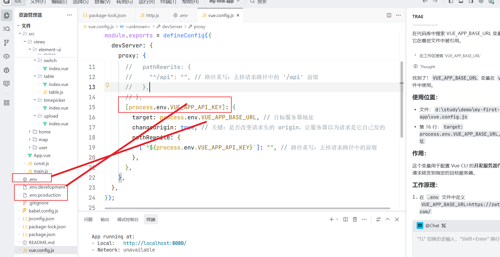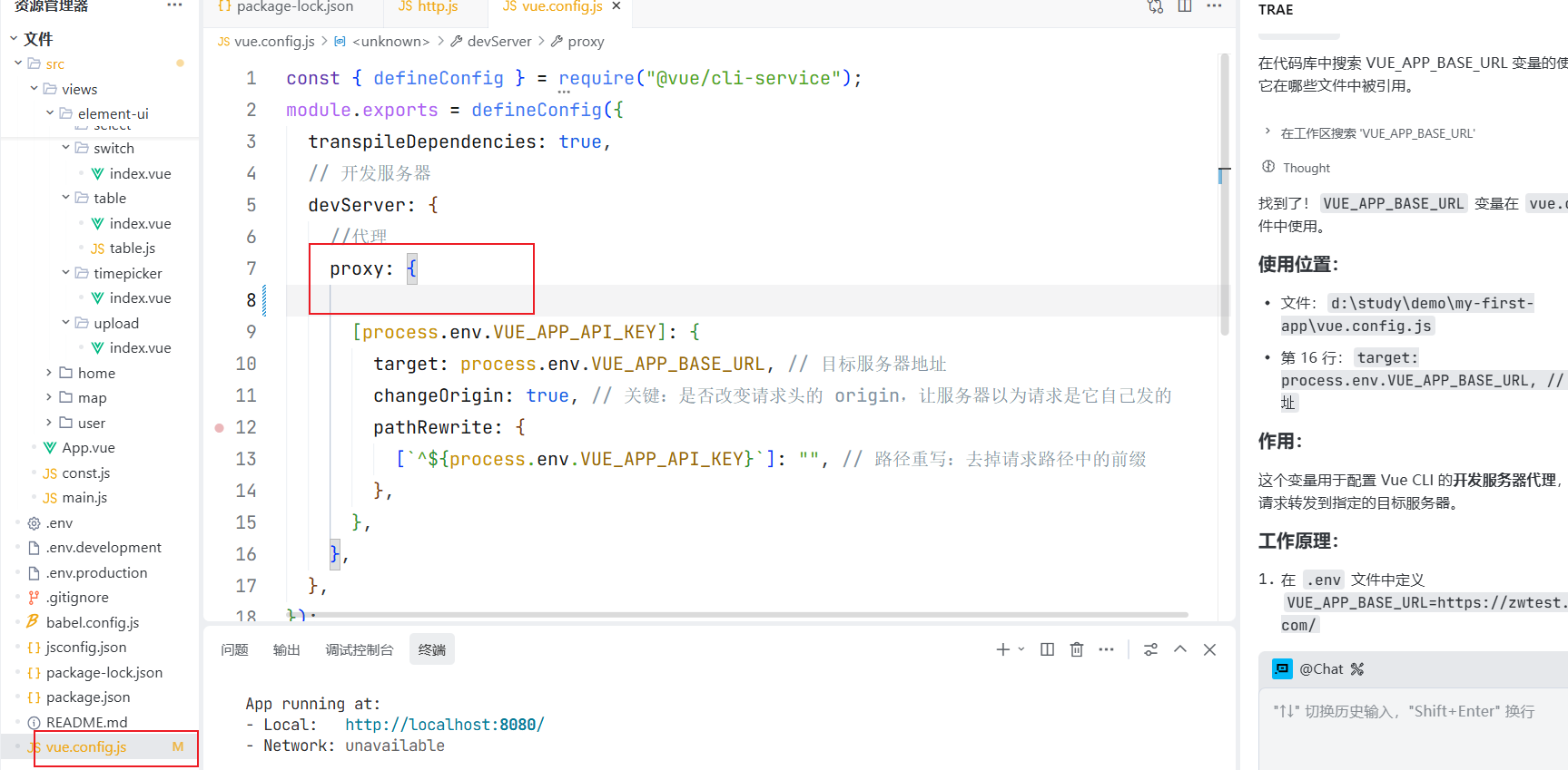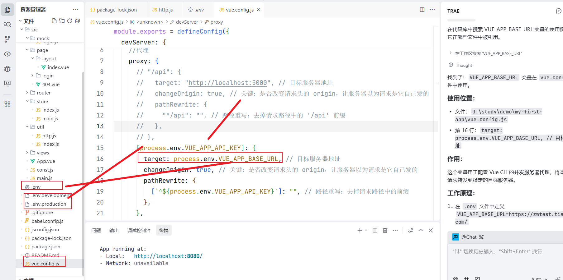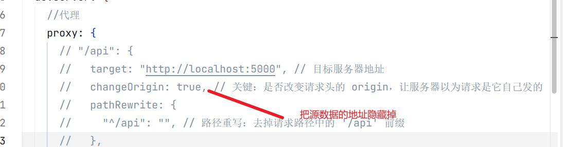 target: process.env.VUE_APP_BASE_URL, // 2. 跨域核心:伪装请求来源,让后端以为是同域请求 changeOrigin: true,