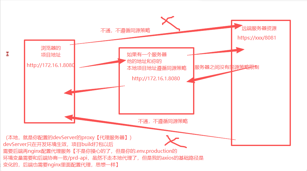 关键:dev server(本地代理服务器)运行在本地,和本地项目地址同源,因此不会触发跨域,要明确区分本地服务器(代理用)和远端服务器(真实请求目标)。
