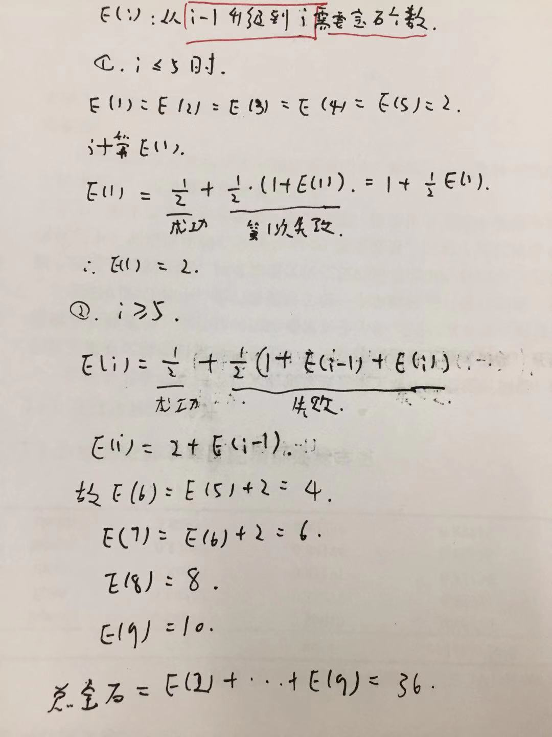 你有一把宝剑。每使用一个宝石,有50%的概率会成功让宝剑升一级,50%的概率会失败。如果宝剑的级数大于等于5的话,那么失败会使得宝剑降1级。如果宝剑的级数小于5的话,失败没有效果。问题是:期望用多少个宝石可以让一把1级的宝剑升到9级?