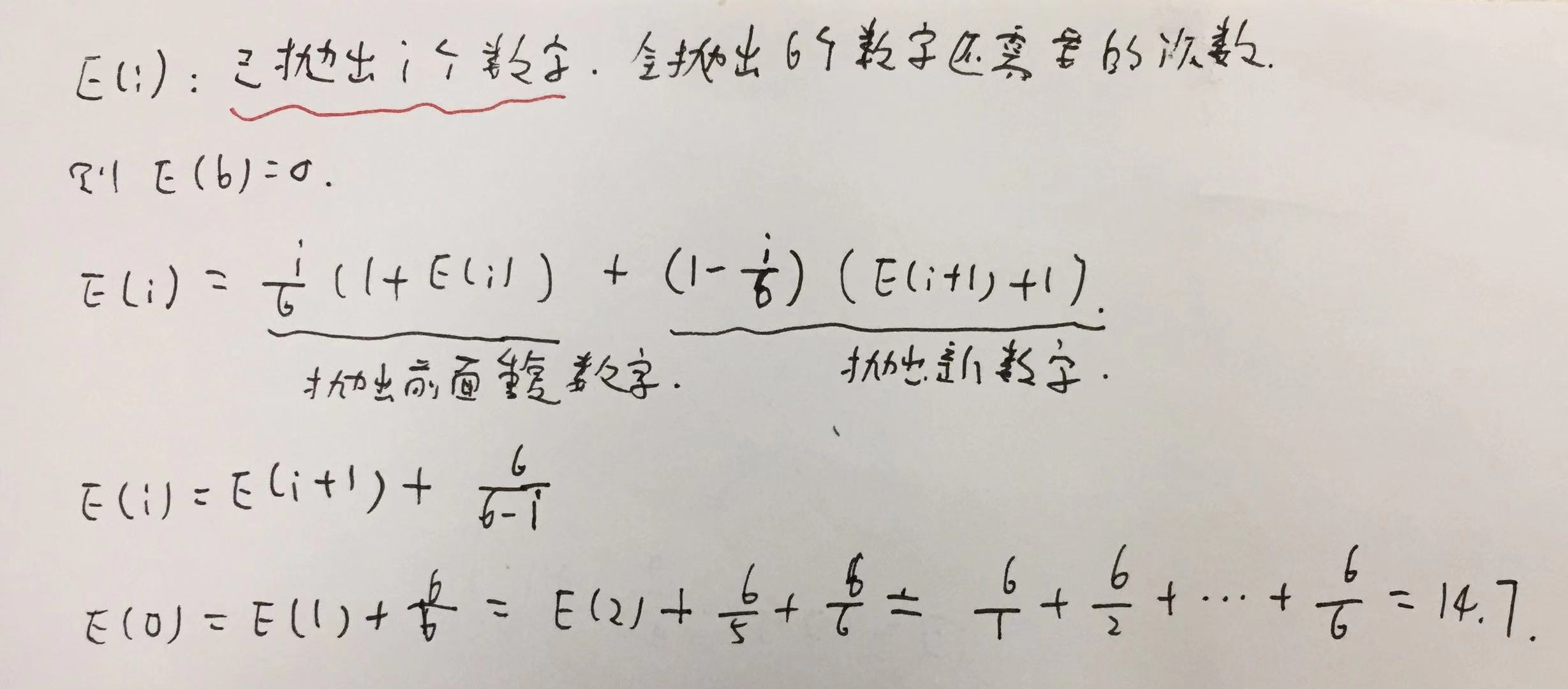 6. 若要使骰子 (六个面)的每个数都出现至少一次 ,那么平均需要掷多少次骰子?即求掷骰子次数的期望