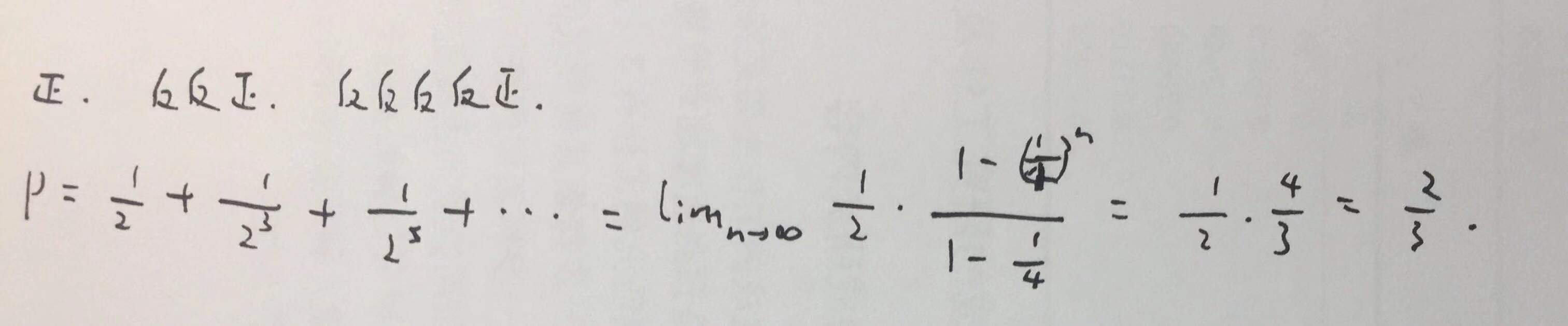 2.连续扔硬币,直到某一人获胜,A获胜条件是先正后反,B获胜是出现连续两次反面,问AB游戏时A获胜概率是?