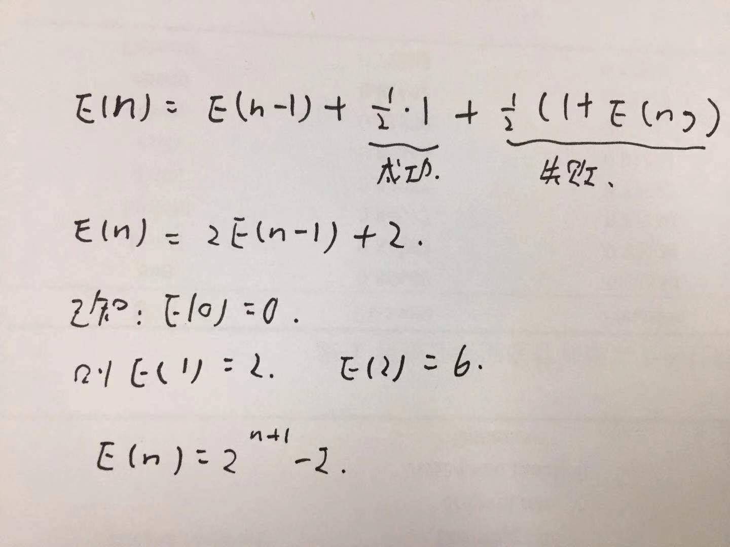 3、所以b=1/4+(1/4)^2+(1/4)^3+......=1/3 - 连续2次抛到硬币朝上 ,则游戏结束。问平均抛多少次游戏可以结束?