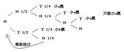 3.小a和小b一起玩一个游戏,两个人一起抛掷一枚硬币,正面为H,反面为T。两个人把抛到的结果写成一个序列。如果出现HHT则小a获胜,游戏结束。如果HTT出现则小b获胜。小a想问一下他获胜的概率是多少?