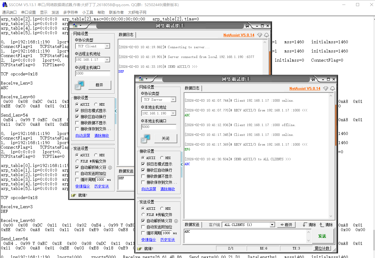 TCP_Client_Send_Data_To_Server((u8*)Remote_ip_REG,(u8*)Remote_Port,(u8*)Local_Port,"ABC",3,NULL);