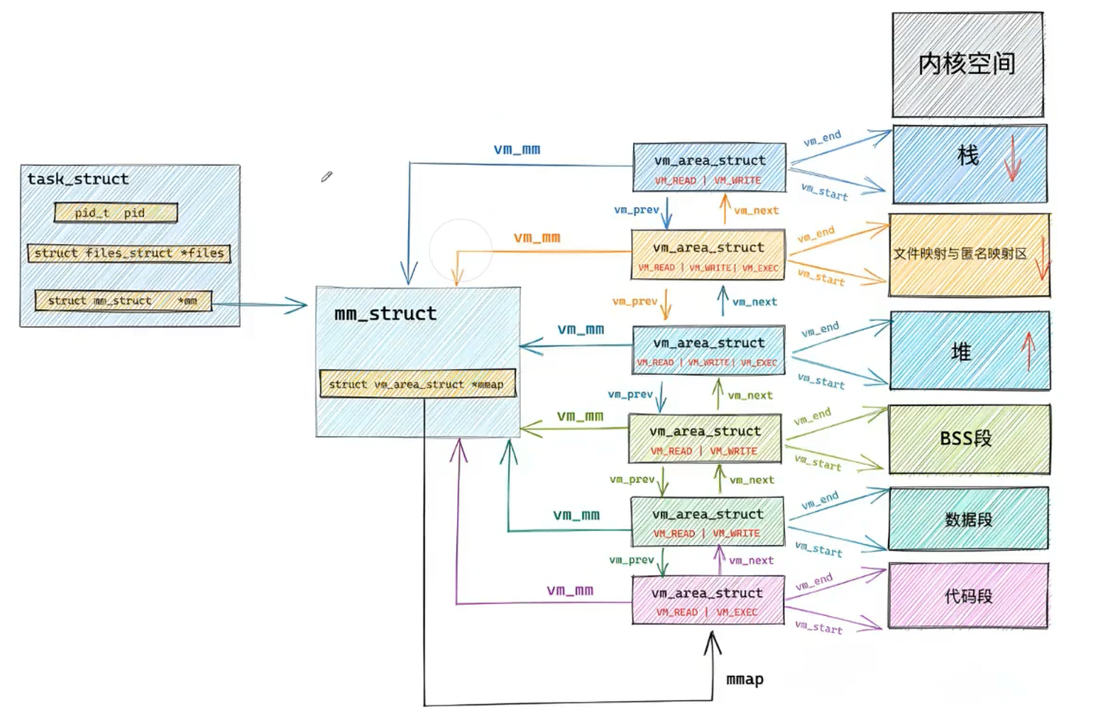 用的是vm_area_struct,上图mm_struct表示汇总了虚拟地址的整体情况,而用vm_area_struct进行区域划分,那么在堆区中再次划分成小区域也是用的vm_area_struct,只要在堆中继续有vm_area_struct就行了。而vm_area_struct也是结构体,也是需要组织起来,一般使用双链表组织,一旦vm_area_struct数量多了就会使用红黑树。