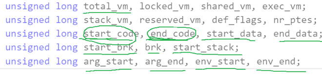 类似与老板给各员工画的一张饼,这张饼是虚假的,但是员工会认为是真实的,同样的这张饼也需要被管理起来,同样是先描述再组织,所以虚拟地址空间本质就是OS对进程画的饼,一定是一个数据结构!通过查找内核代码可以找到一个mm_struct的结构体,这个就是虚拟地址空间,其中有下图所示的变量来划分区域。