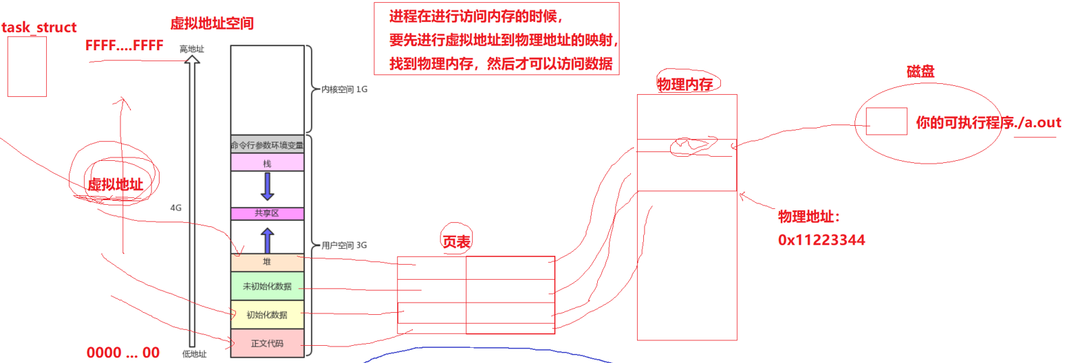 进程在进行访问内存时,会先进行虚拟地址与物理地址的映射找到物理内存,才可以访问数据,所以一定会有一个页表来进行映射虚拟内存与物理内存。