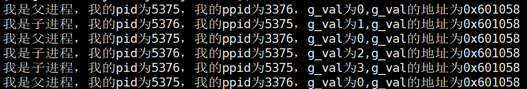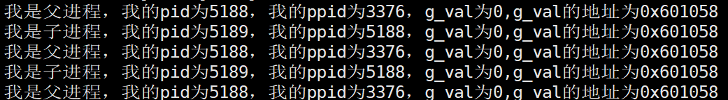 printf("我是子进程,我的pid为%d,我的ppid为%d,g_val为%d,g_val的地址为%p\n",getpid(),getppid(),g_val,&g_val);
