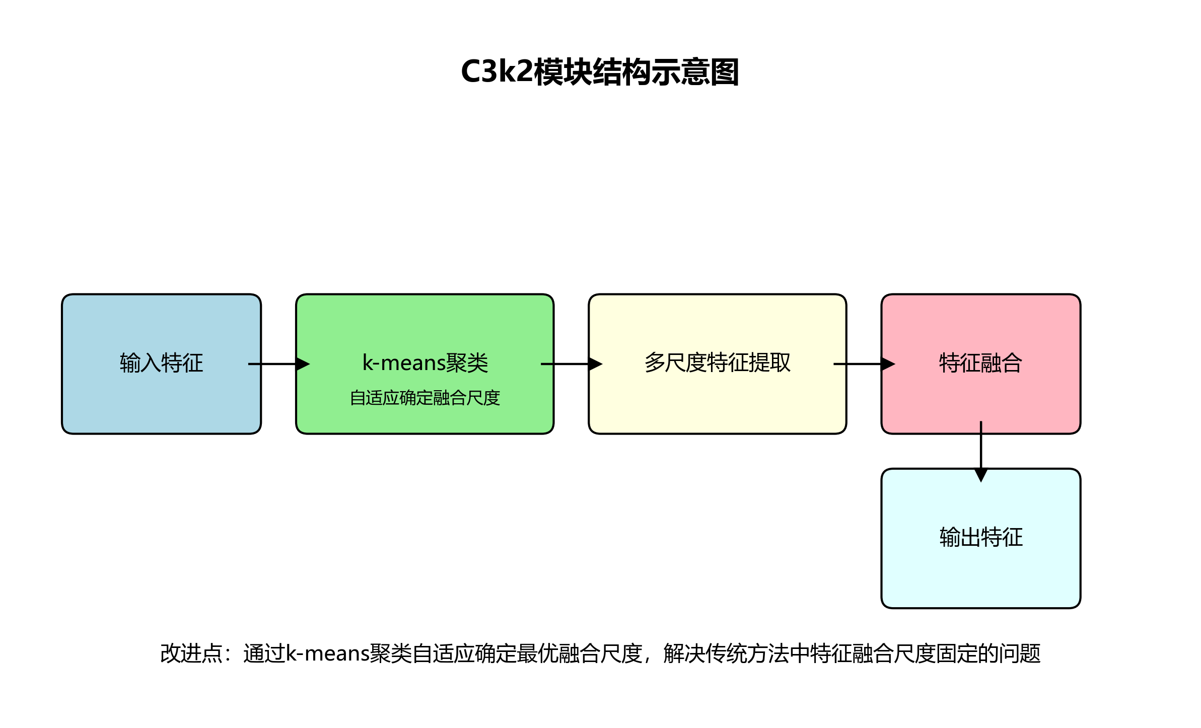 C3k2模块是一种改进的跨尺度特征融合模块,通过引入k-means聚类算法自适应地确定最优融合尺度,解决了传统方法中特征融合尺度固定的问题。