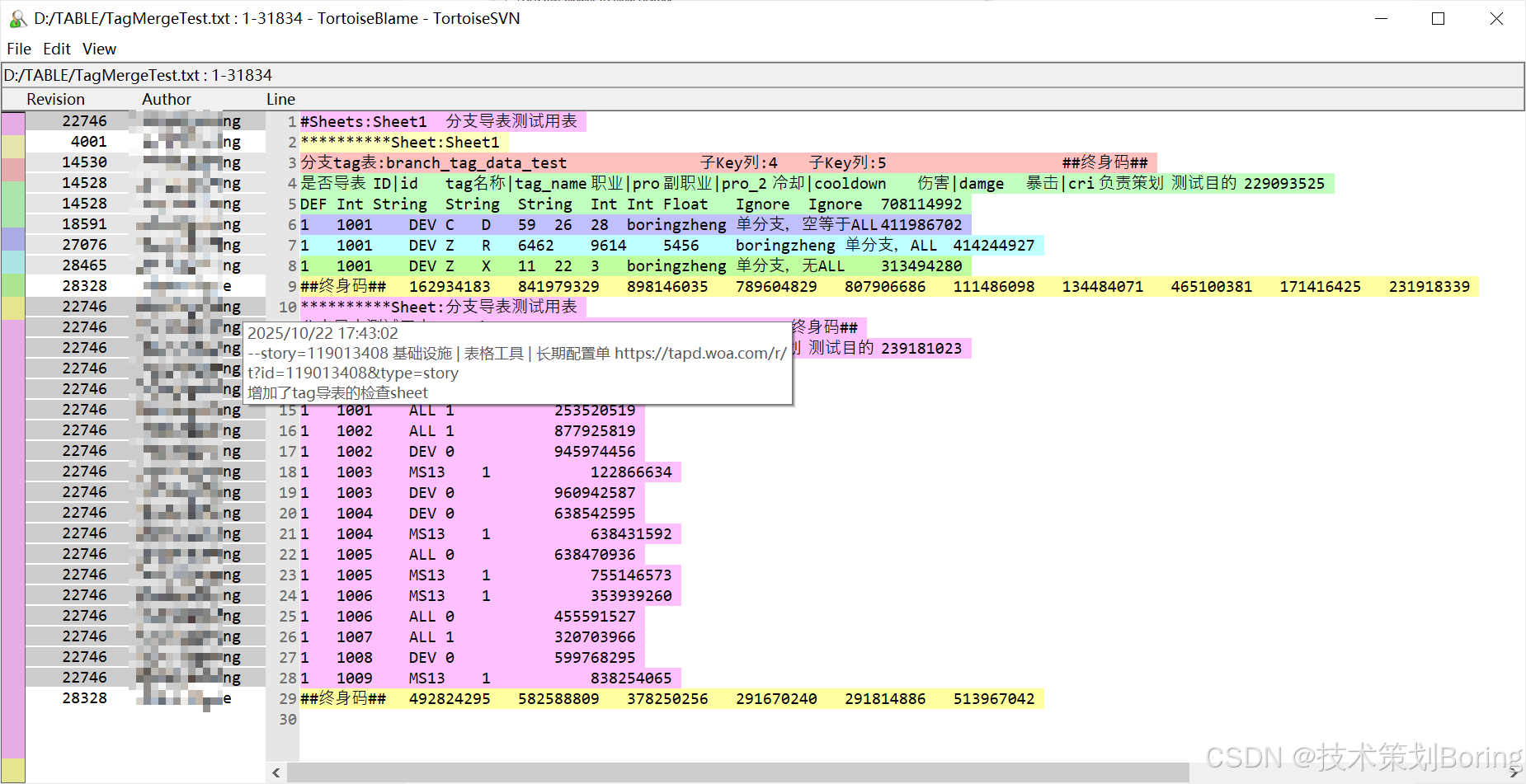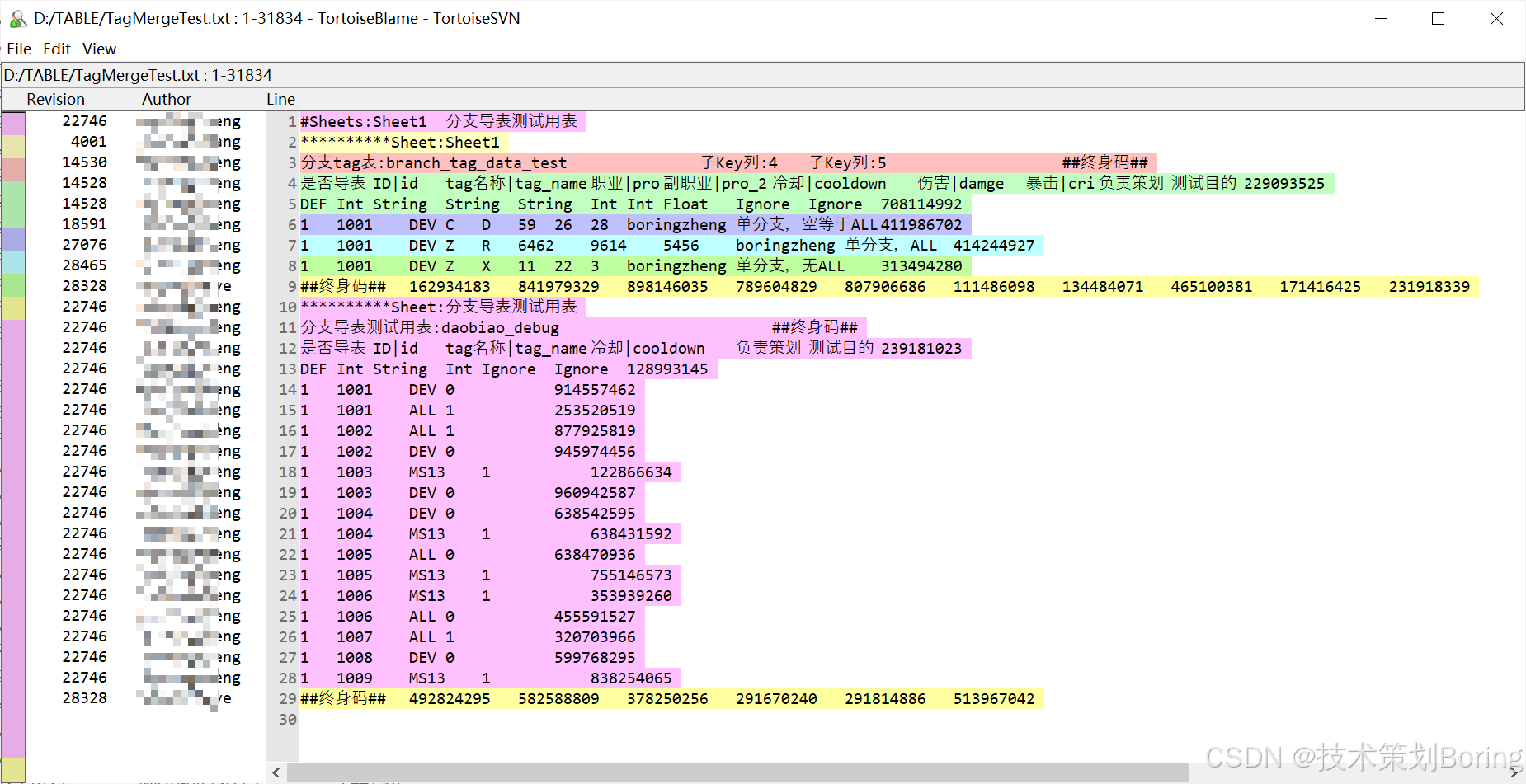 - 随后会弹出一个文本窗口(TortoiseBlame),左侧显示版本号和作者,右侧显示具体内容。
