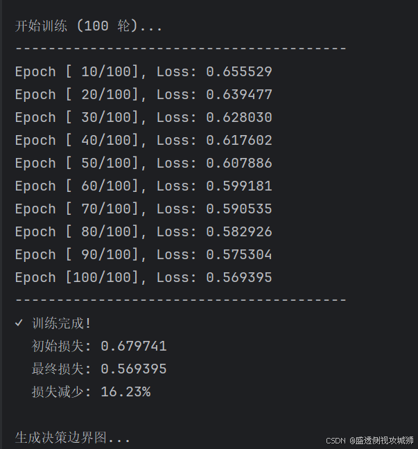 - 文章的核心部分聚焦于一个完整的二分类任务实战,从非线性数据的生成与说明开始,逐步演示了定义神经网络结构、选择损失函数与优化器、执行模型训练、评估测试性能以及可视化决策边界与损失曲线的全过程,并提供了完整可运行的代码汇总。