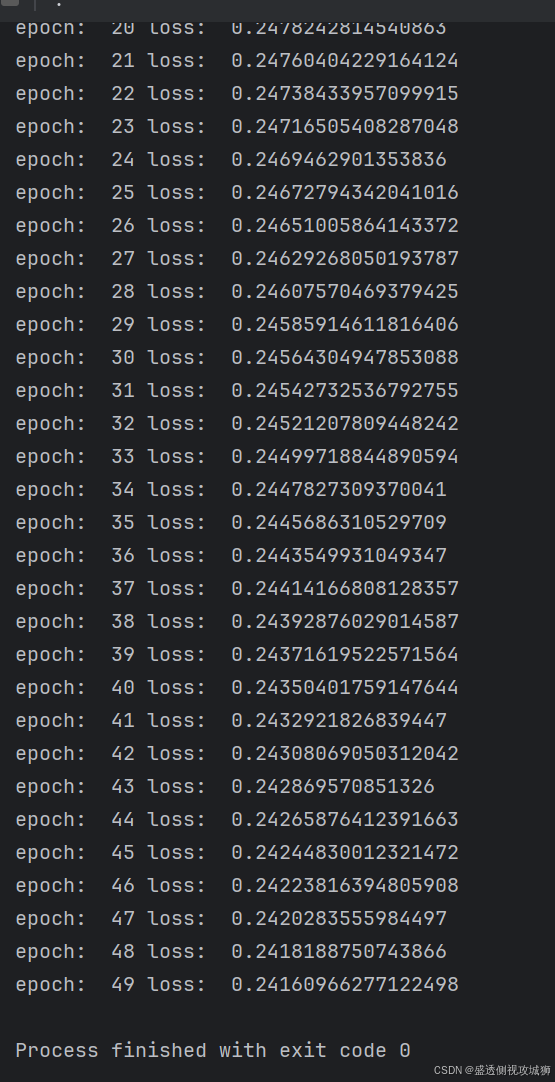 for epoch in range(50):进行 50 次训练迭代。y_pred = model(x):进行前向传播,使用当前模型参数计算输入数据x的预测值。loss = criterion(y_pred, y):计算预测值和目标值y之间的损失。optimizer.zero_grad():清除上一轮训练时的梯度值。loss.backward():反向传播,计算损失函数相对于模型参数的梯度。optimizer.step():根据计算出的梯度更新模型参数。