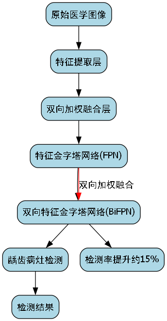 BiFPN是一种高效的多尺度特征融合网络,它通过双向连接和加权特征融合,实现了更好的特征复用和跨尺度信息传递。在龋齿检测任务中,不同大小的龋齿病灶需要不同尺度的特征进行识别,BiFPN能够很好地解决这个问题。