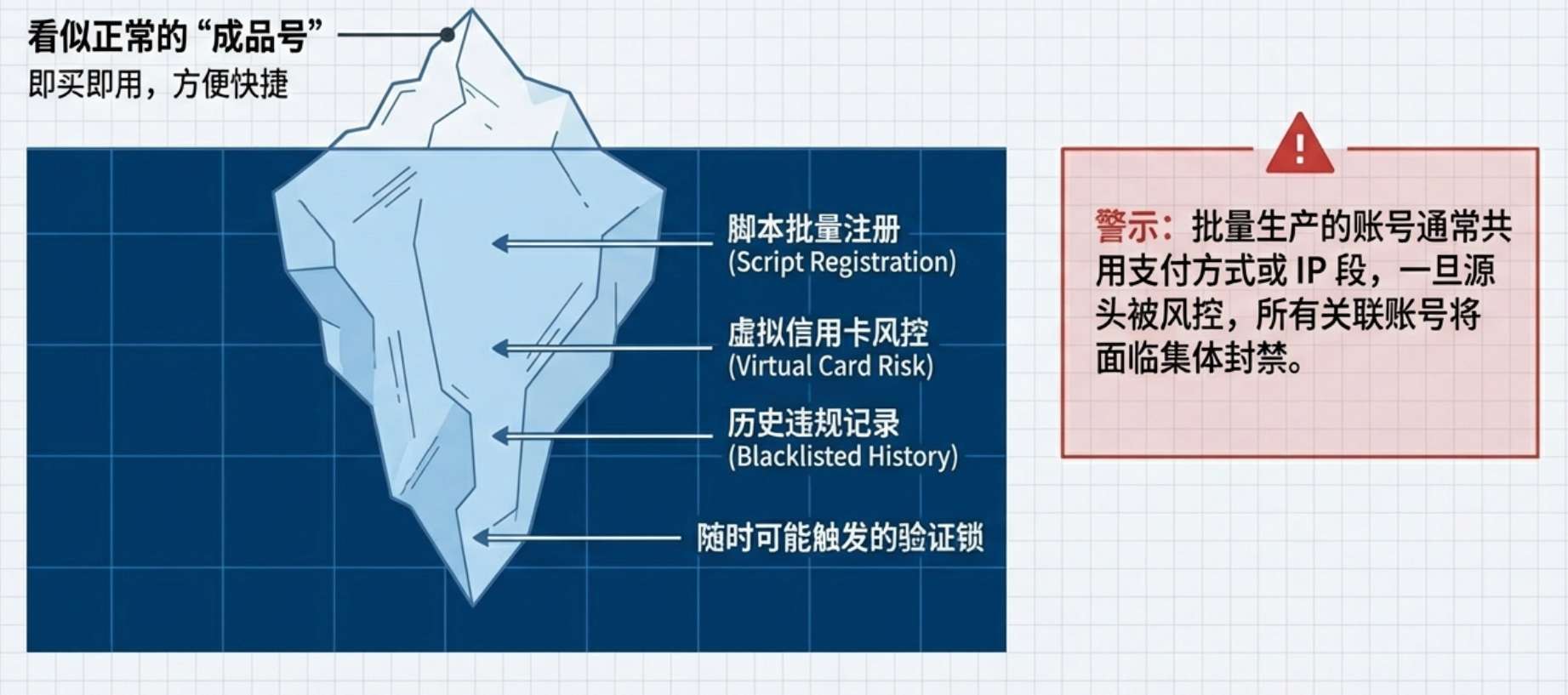 - 批量注册的风险: 号商通常利用脚本和虚拟信用卡批量生成账号。一旦关联的虚拟卡被风控,成千上万个关联账号会瞬间失效。