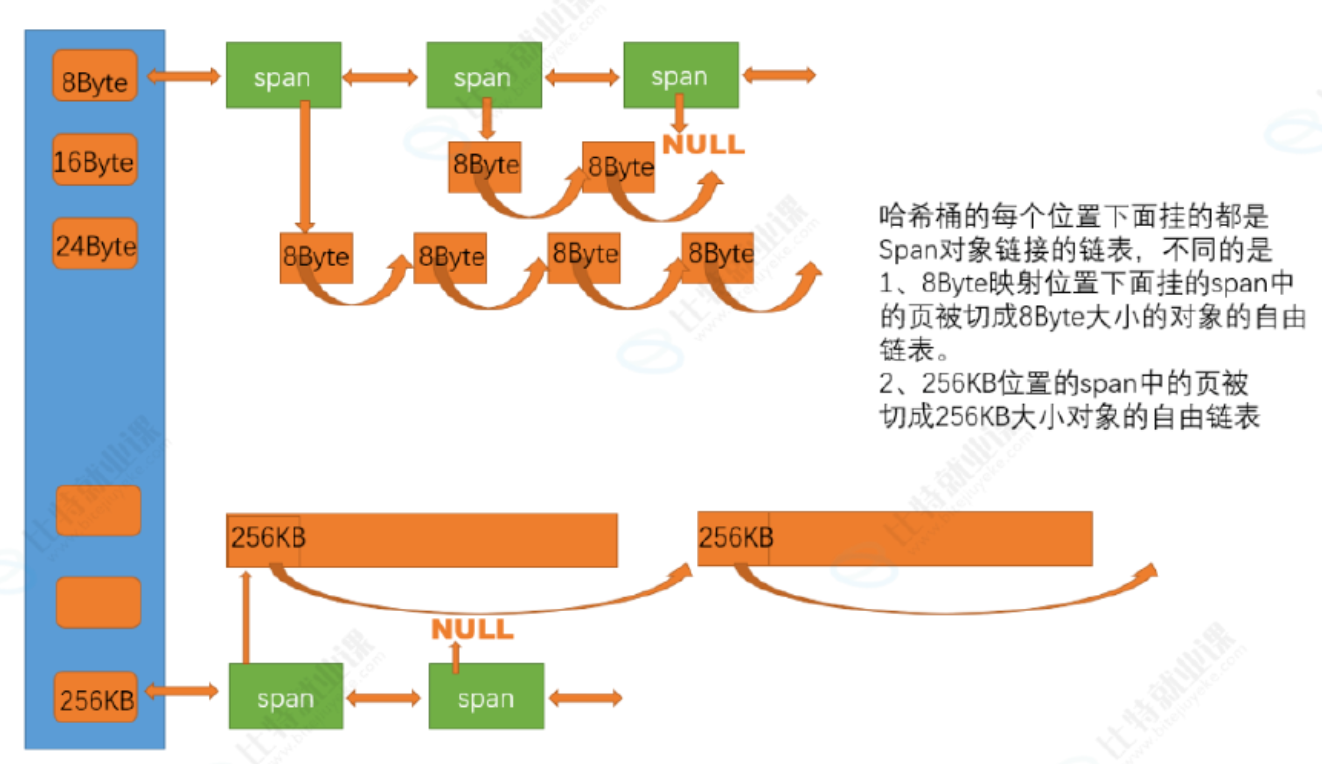 central cache也是一个哈希桶结构,他的哈希桶的映射关系跟thread cache是一样的。不同的是他的每个哈希桶位置挂是SpanList链表结构,不过每个映射桶下面的span中的大内存块被按映射关系切成了一个个小内存块对象挂在span的自由链表中。