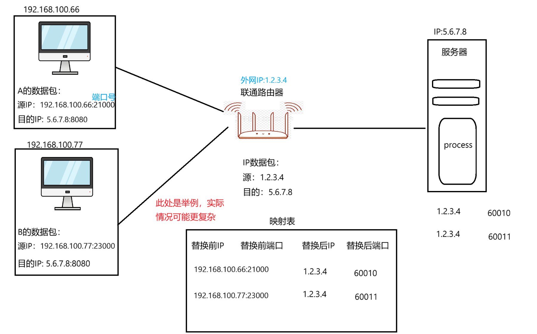 首先内网设备知道了源IP和目地IP及端口号,我们知道要访问外网设备需要外网IP ,对方在返回响应时也需要外网IP 才能做到,那么我们以联通路由器为例(有外网IP),一个联通路由器在一定时间内可能会有成千上万的内网IP进行访问,我们应该如何才能做到区分并返回正确响应,在NAT设备中维护了一个表,包含了映射关系(如果端口号相同也会进行一定的替换),然后会将替换好的IP地址与端口号发往目的IP和端口,此处就完成了发送,返回响应也根据表中数据进行修改后即可
