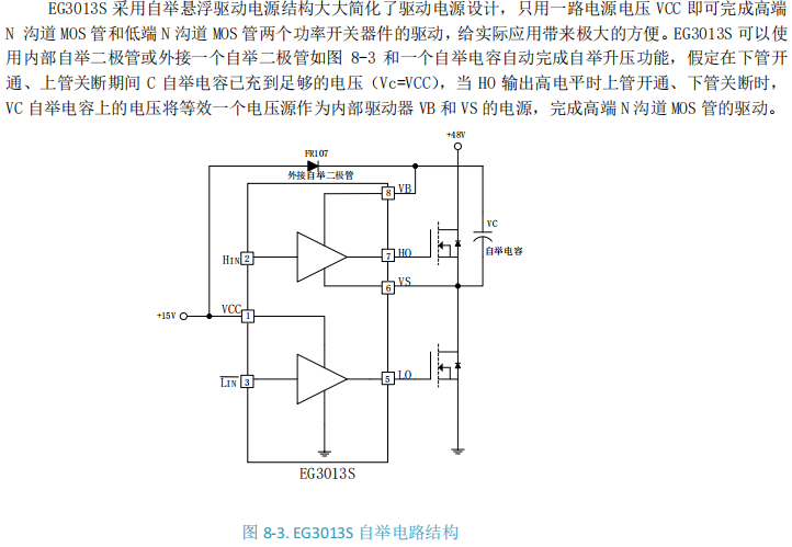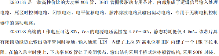 驱动能力与EG3012S相同,适用于中功率MOSFET或作为前级驱动。