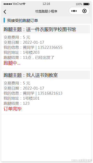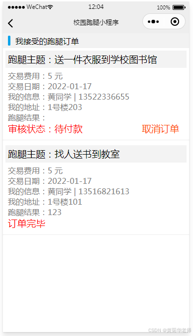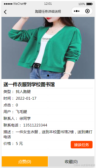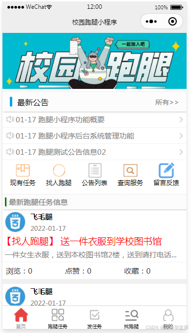 雇主\]接单任务列表:雇主订单列表,有用户接单后自动生成订单 \[雇主\]去付款或者删除订单:有人接单后,雇主需要去支付费用,没有支付前可以删除订单 \[跑腿\]接单任务列表:跑腿人员订单列表,接单后自动生成订单 \[跑腿人员\]删除订单:如果雇主没有按时支付订单的跑腿费用,跑腿人员可以取消订单 \[跑腿人员\]去跑腿:雇主支付订单后,跑腿人员,点击去跑腿,弹出确认界面,点击提交 \[雇主\]确认跑腿订单:跑腿人员去跑腿后,确认订单,流程完毕 我的收藏:我收藏的跑腿信息列表 我发布的跑腿订单:雇主发布的跑腿任务,有人接单的订单列表 我接受的跑腿订单:跑腿人员接单的订单列表 用户信息:填写姓名、qq、邮箱、备注等信息 退出系统:清除缓存,返回小程序首页 留言:用户可以在小程序对管理平台留言。 ## 作品截图