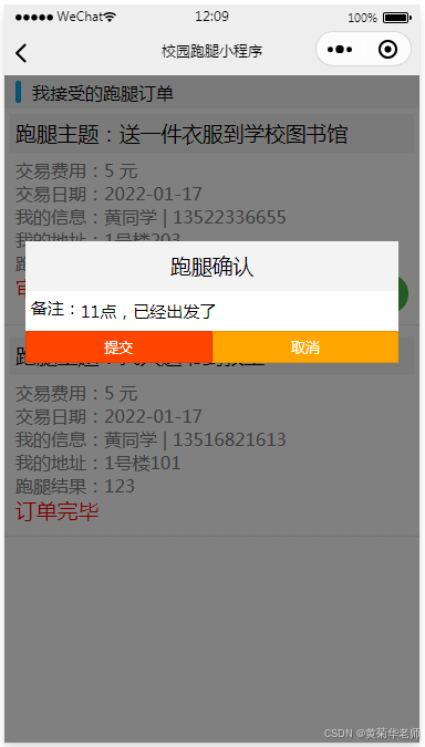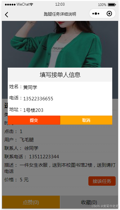 接该任务:点击接该任务按钮,弹出填写接单人信息,填写姓名、电话、接单人地址后提交。