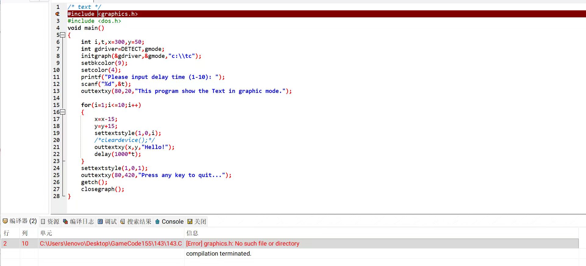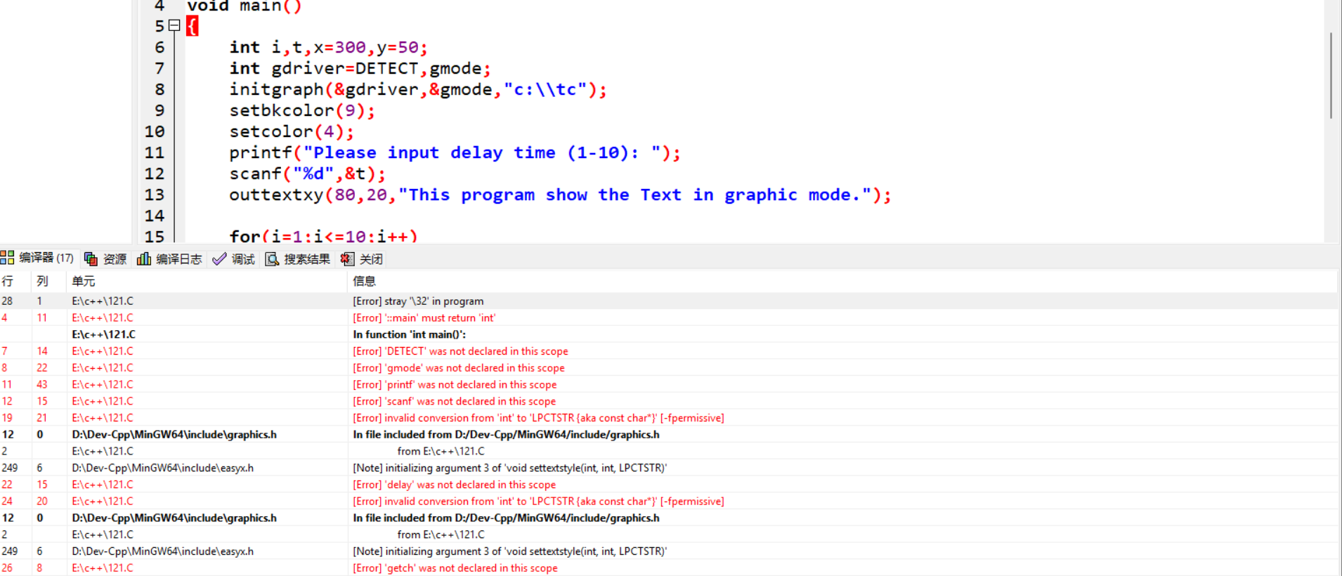 将原.c文件直接置于Dev-c++ 5.11中编译,发现头文件缺失 :#include <graphics.h> 。