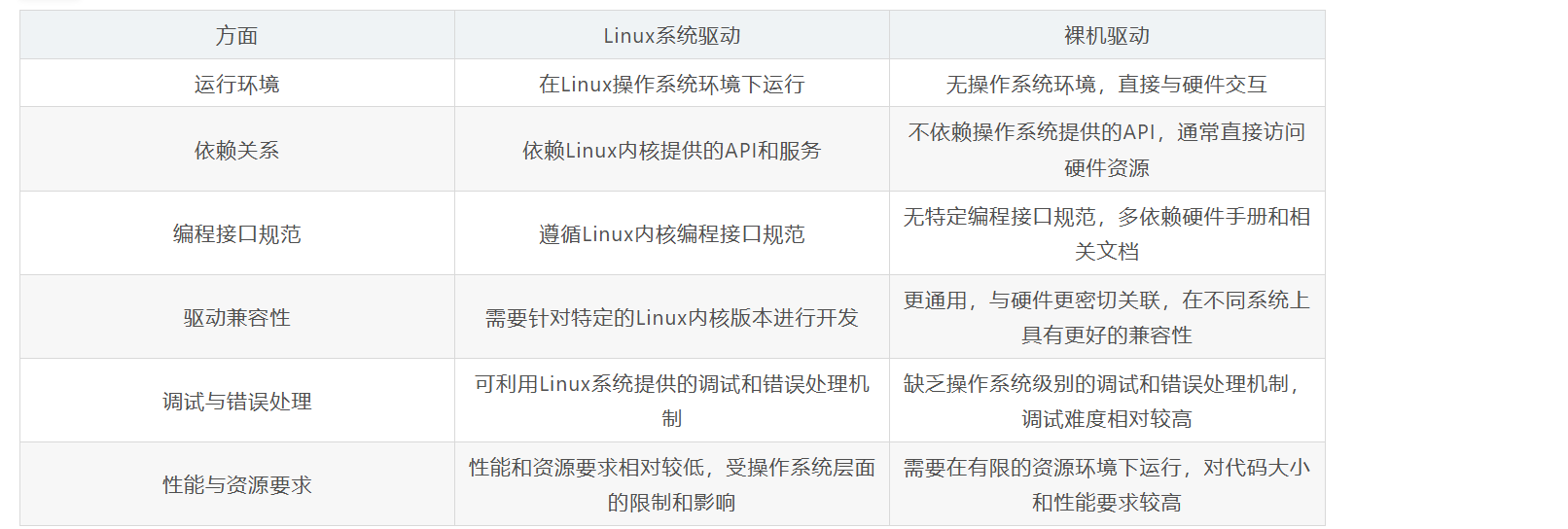 裸机驱动开发更加底层一些,直接跟寄存器打交道,虽然一些MCU提供了库,但相比Linux驱动开发还是更加底层了一些。