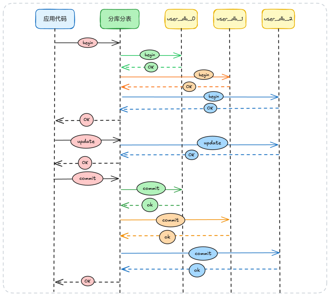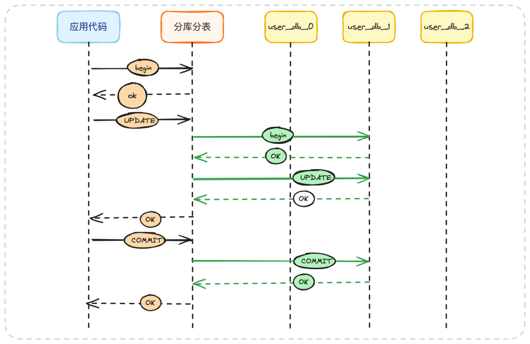 另一种是优化方案,即延迟事务 :应用层执行 Begin,中间件什么也不做 ,只是在内存中标记一下事务已开始。当应用层执行第一条 SQL(比如 UPDATE ... WHERE user_id = 50),中间件解析出它需要路由到 db_0。此时,中间件检查 db_0 上是否已开启事务,发现没有,于是在 db_0 上真正开启一个本地事务,并执行 SQL。接着,应用层又执行第二条 SQL(UPDATE ... WHERE user_id = 51),路由到 db_2。中间件检查 db_2,也在 db_2 上开启一个本地事务,并执行 SQL。如果应用层执行第三条 SQL(UPDATE ... WHERE user_id = 50 ...),路由到 db_0,中间件检查 db_0,发现事务已开启,于是复用 该事务执行 SQL。最后,当应用层执行 Commit 时,中间件才将 db_0 和 db_2 上所有"延迟开启"的事务,统一执行 Commit。