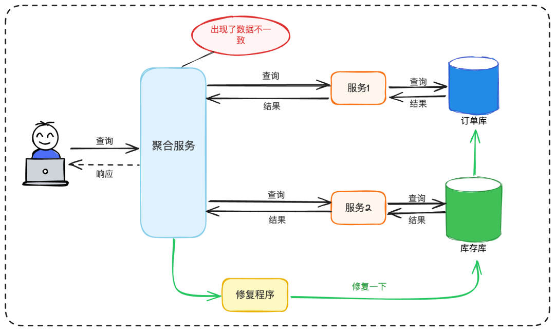 在某些高时效性场景下,还可以采用实时读取修复(在线) 。比如在用户查询订单详情时,聚合服务需要同时调用订单库和库存库。当它在读取时发现数据不一致(订单 'CONFIRMED',库存 'LOCKED'),它可以"机智"地返回给用户一个"处理中"的友好提示,并异步触发一个修复程序去修正这个脏数据。