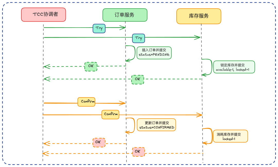 如果所有 Try 均成功,TCC 框架开始调用 Confirm 阶段。