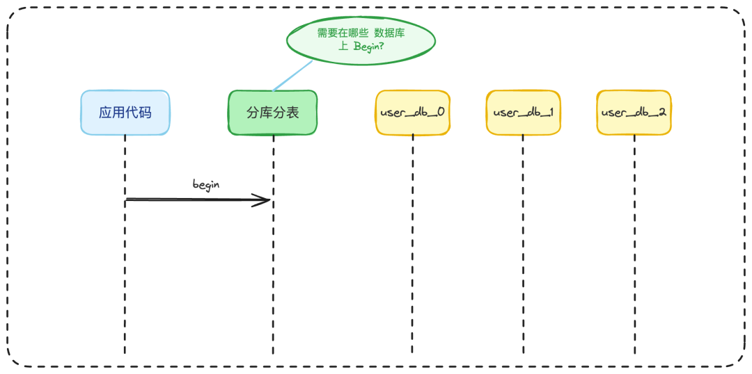 这个方案要解决一个核心痛点:当应用层执行 Begin(开启事务)时,中间件根本无法预测你接下来的 SQL 会落到哪个分库上。