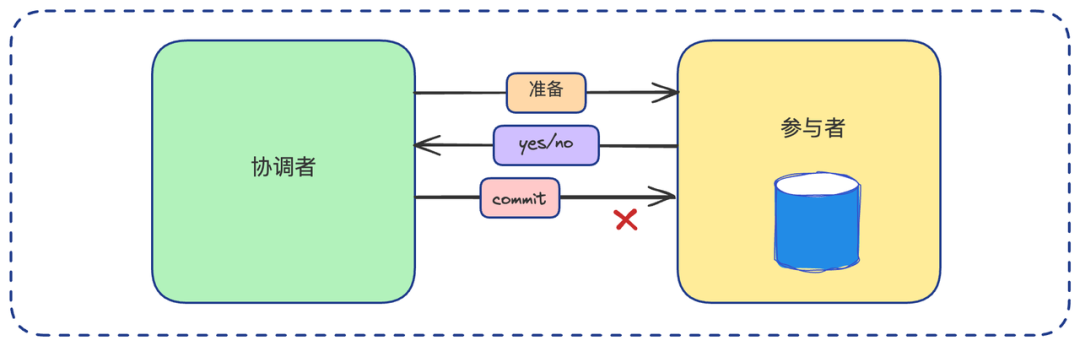 它分为"准备"和"提交"两个阶段。在准备阶段 ,协调者向所有参与者发出"准备"指令。参与者收到后,开始执行本地事务操作(如修改数据、锁定资源),但并不提交。它们会记录下用于后续提交的 Redo 日志和用于回滚的 Undo 日志,然后向协调者回复准备就绪(Yes)或无法准备(No)。