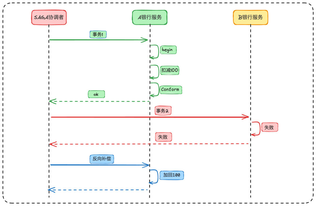 我们用跨行转账的例子来理解:在正向流程 中,事务1(A 银行) UPDATE account SET balance = balance - 100 WHERE id = 'A',立即提交 。紧接着,事务2(B 银行) UPDATE account SET balance = balance + 100 WHERE id = 'B',但执行失败 (例如 B 账户被冻结)。此时,SAGA 启动反向补偿 ,执行补偿事务1(A 银行):UPDATE account SET balance = balance + 100 WHERE id = 'A' 并立即提交,即 A 银行加回100 块。