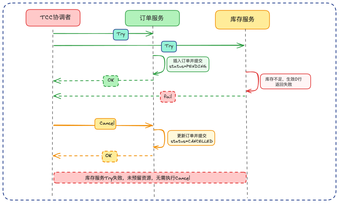 如果 Try 阶段中,库存服务因并发导致 available_stock 不足而失败,TCC 框架开始调用 Cancel 阶段。