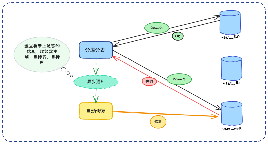 然后,我们有一个独立的自动修复服务 来消费这条消息。这个服务会根据业务逻辑,来决定是正向修复(用 db_0 已提交的数据去强行修复 db_2 的数据)还是逆向补偿(把 db_0 的数据给回滚了)。这个修复逻辑通常是和业务强相关的,需要业务方来定义和接入。