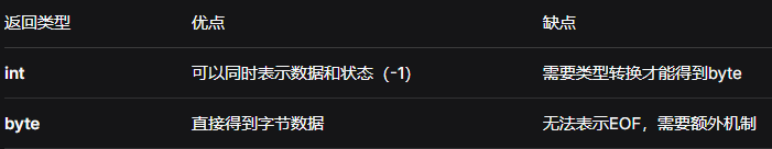 原因:计算机读取文件时,实际读到的数据是无符号8位整数(0-255),但Java的byte类型是有符号的(-128到127)。为了避免混淆和方便表示EOF,API设计者选择用int来包装这个无符号字节值